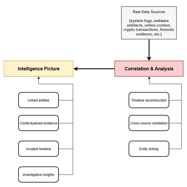 The goal is to transform heterogeneous outputs (produced by different tools, at different times, and for different purposes) into a coherent intelligence picture. One that allows investigators to reason about relationships, sequences, and